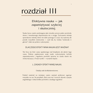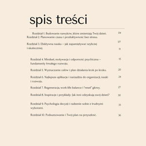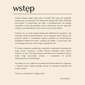 „Odzyskaj swój dzień” to praktyczny i rzetelny eBook stworzony z myślą zarówno o osobach pracujących, jak i uczniach borykających się z trudnościami w nauce. Znajdziesz w nim sprawdzone metody efektywnego planowania, zarządzania obowiązkami oraz eliminowania rozpraszaczy. Poznasz także skuteczne techniki uczenia się i zapamiętywania, które pomogą Ci przyswajać wiedzę szybciej i skuteczniej. Dzięki prostym sposobom pokonasz prokrastynację, wypracujesz zdrowe nawyki i zwiększysz swoją produktywność — bez zbędnego stresu i presji. To przewodnik, który pomoże Ci osiągnąć cele zawodowe oraz szkolne, zachowując równowagę i spokój na co dzień.